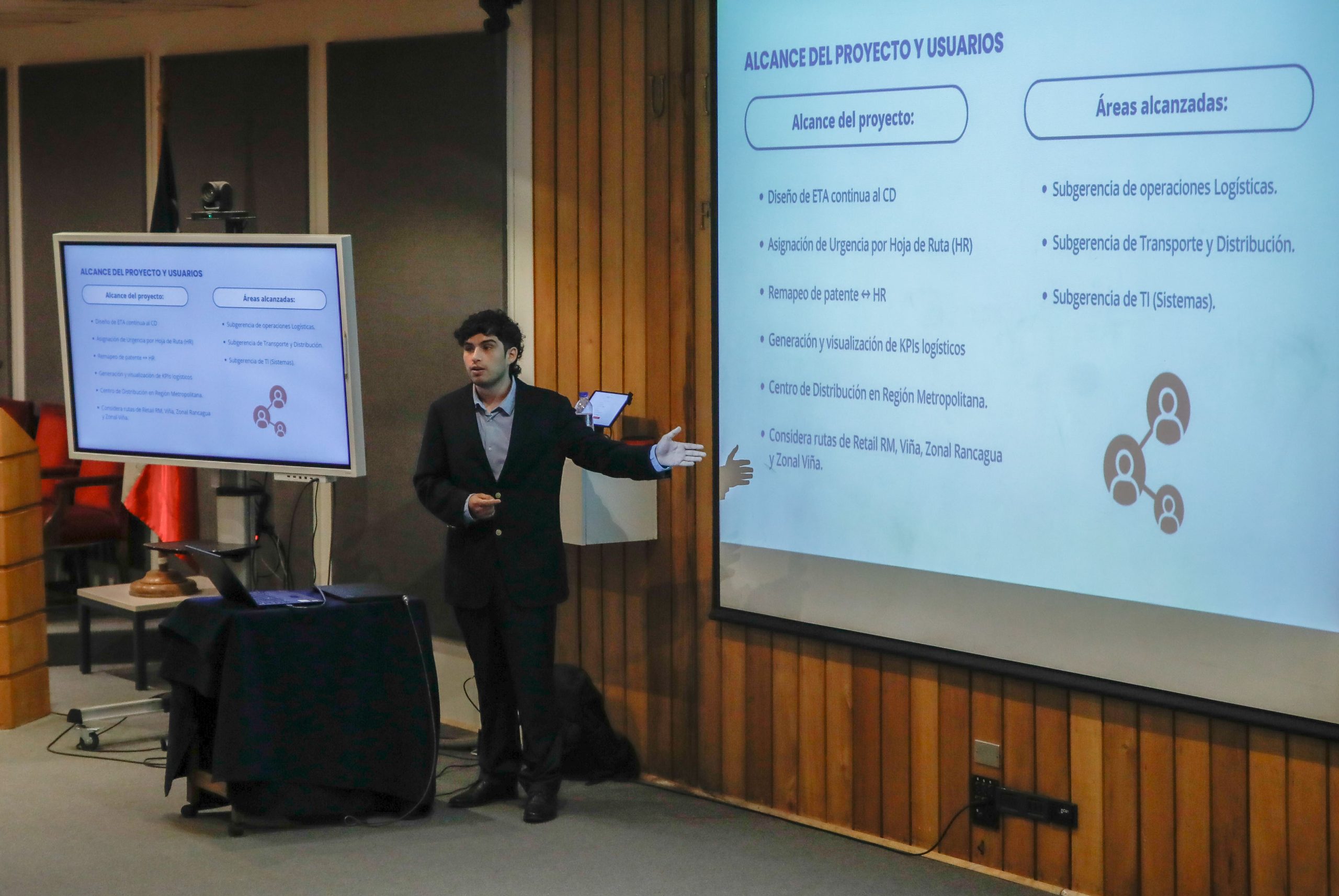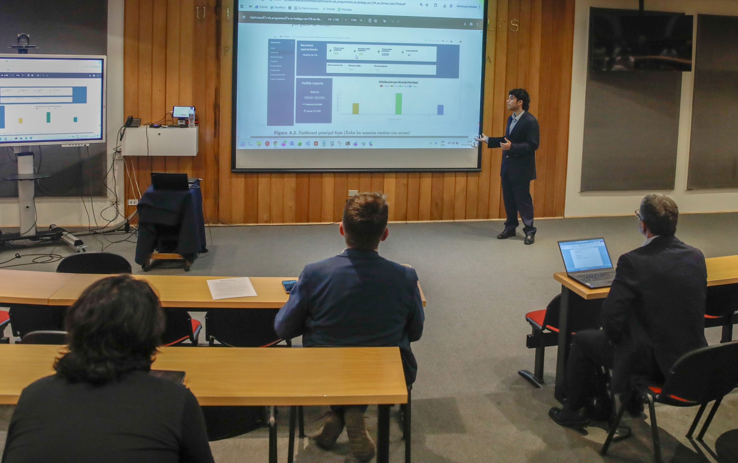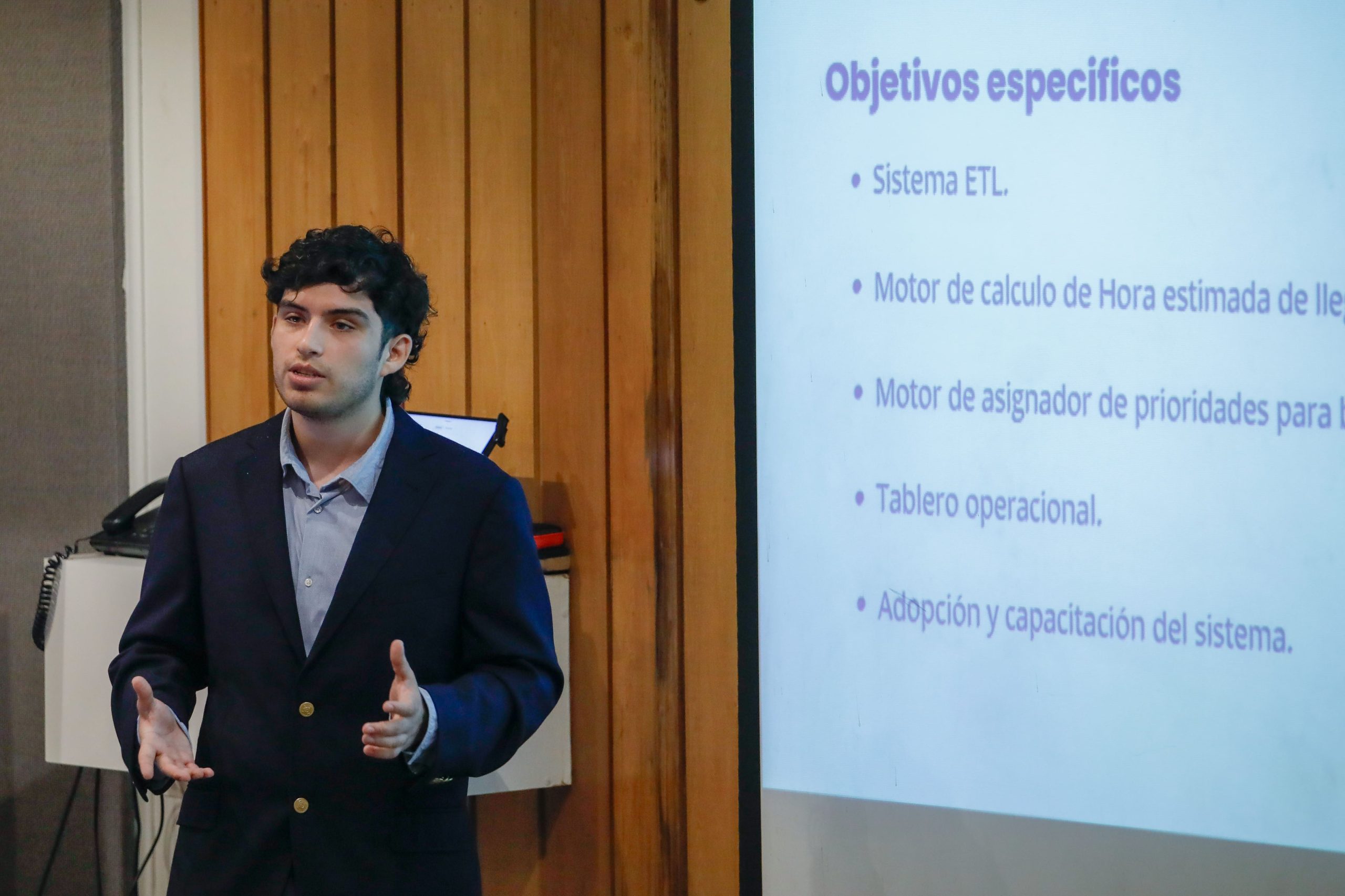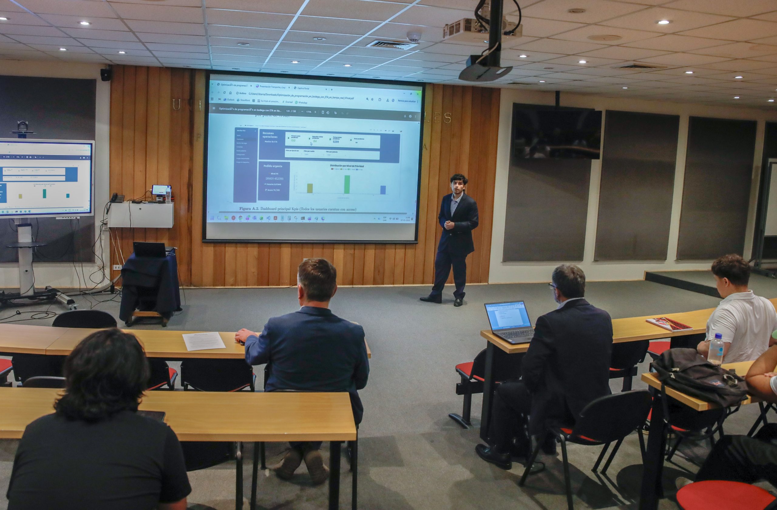 Cristóbal Sagredo presentó su proyecto “Optimización de programación en bodega con ETA en tiempo real”, realizado con la guía del profesor Suchan. La comisión evaluadora contó con el profesor Juan José Negroni.