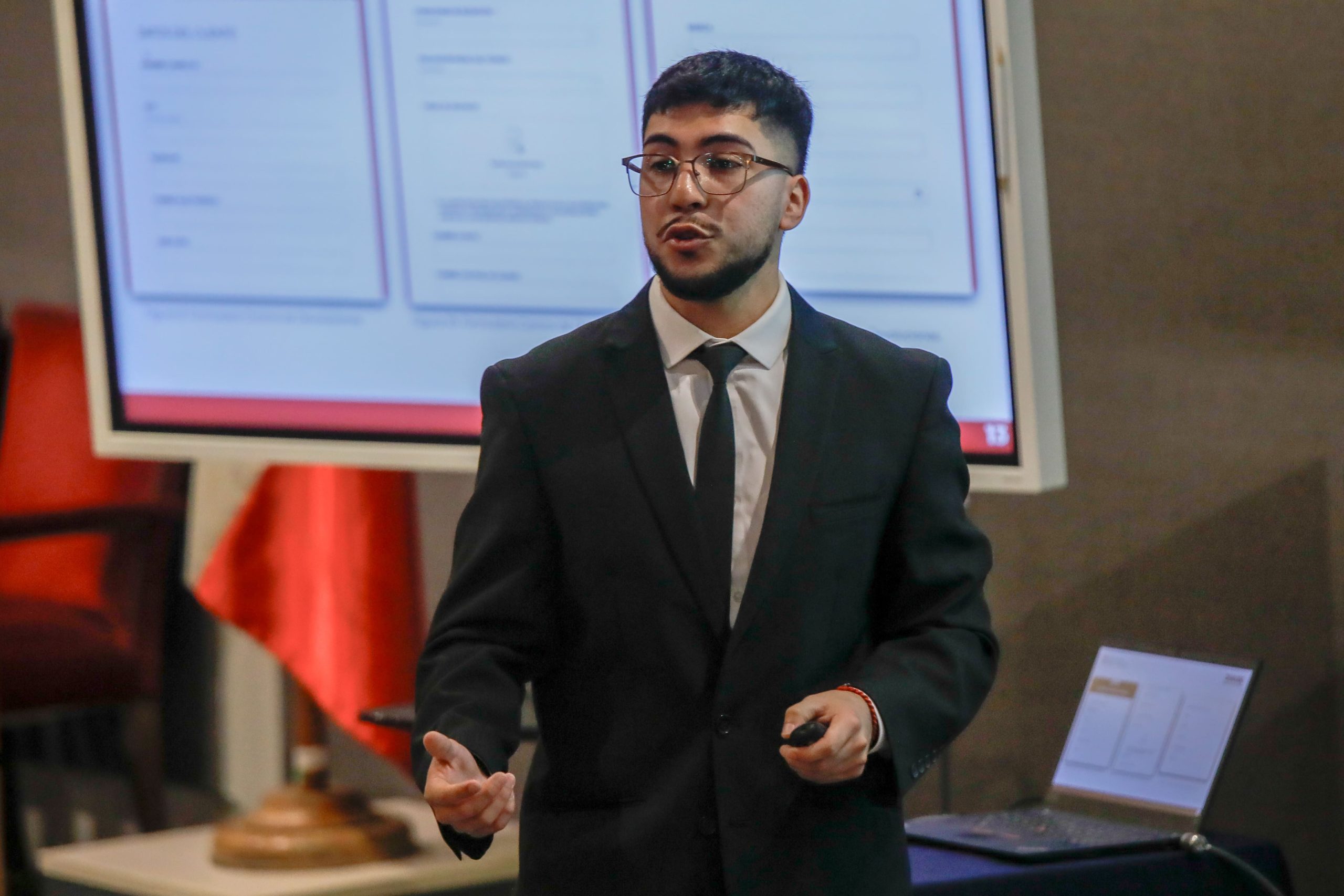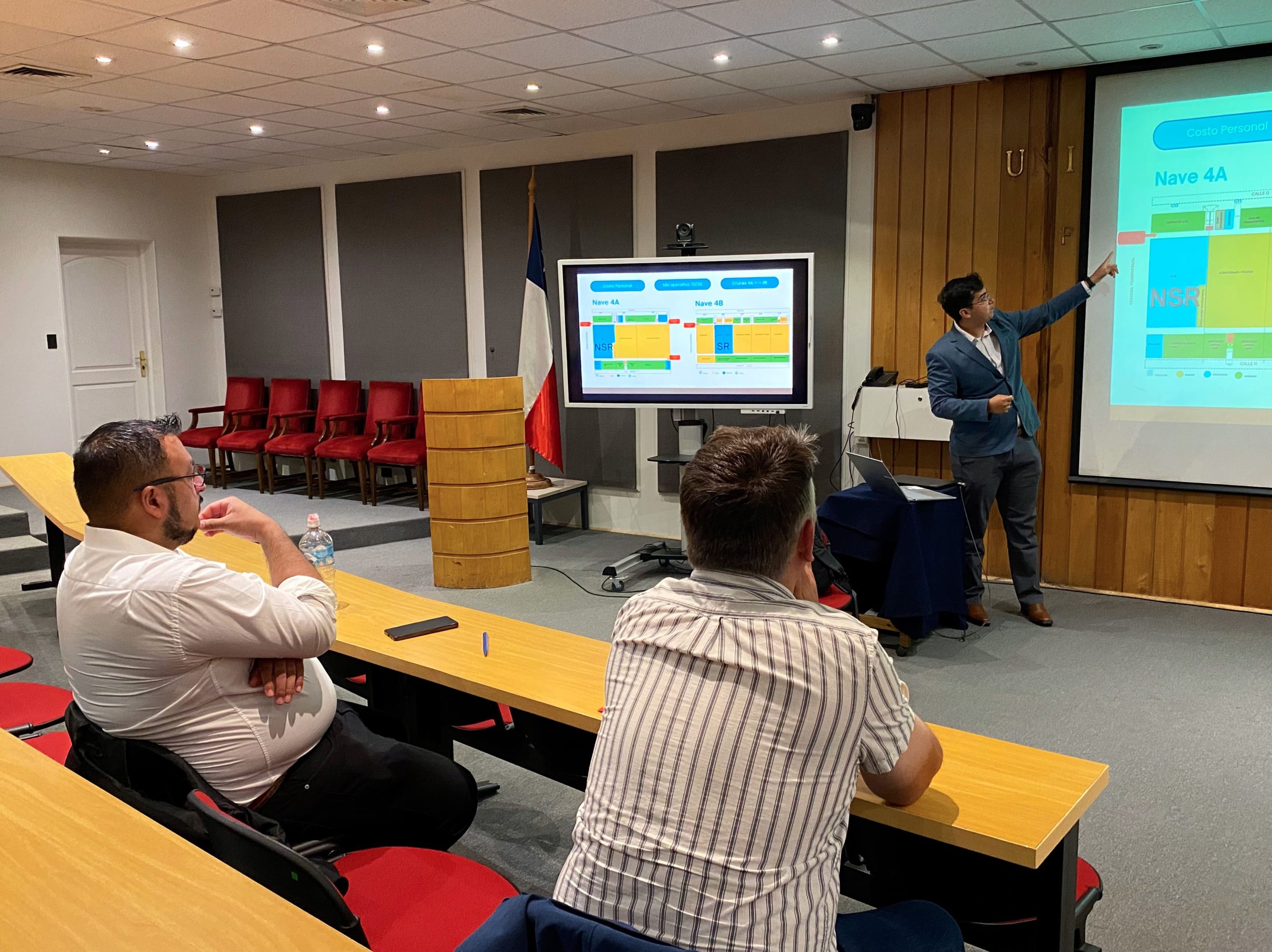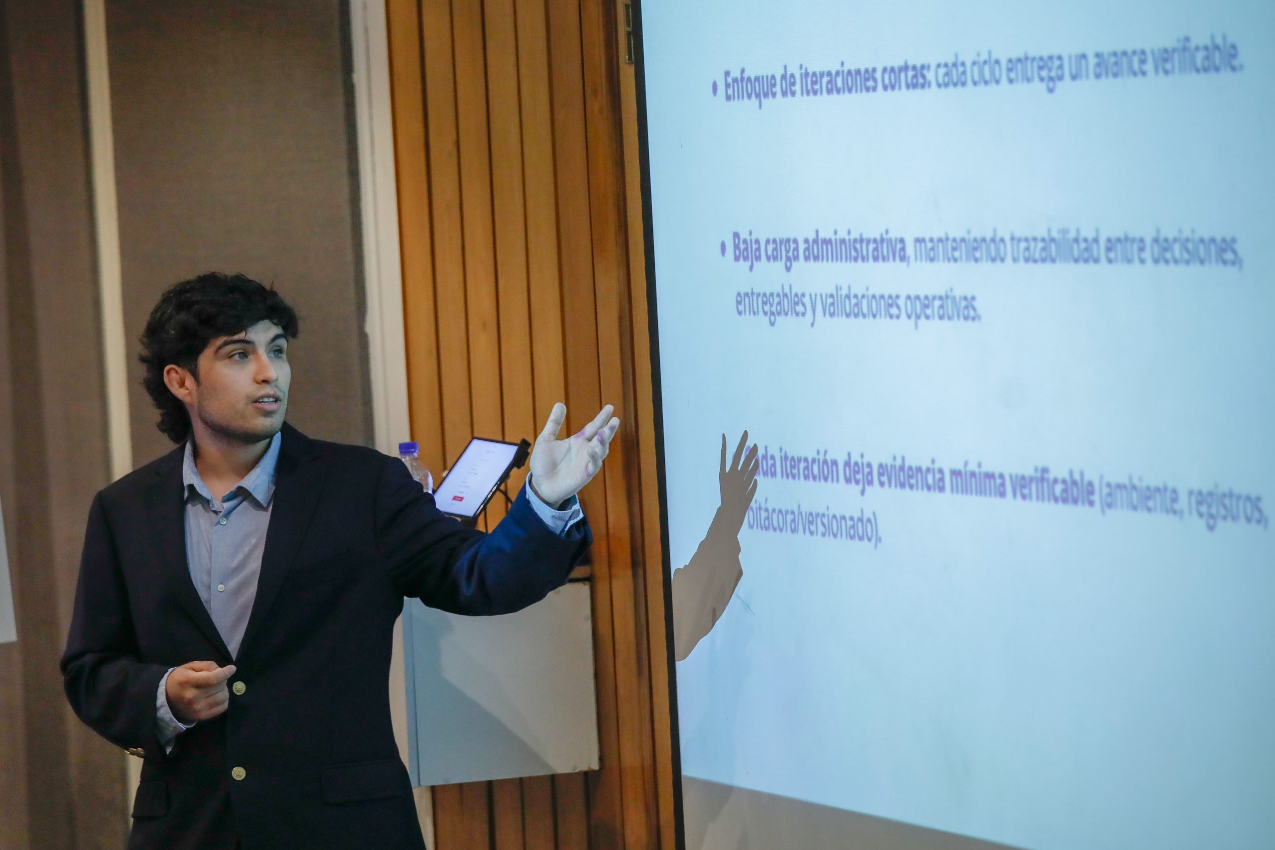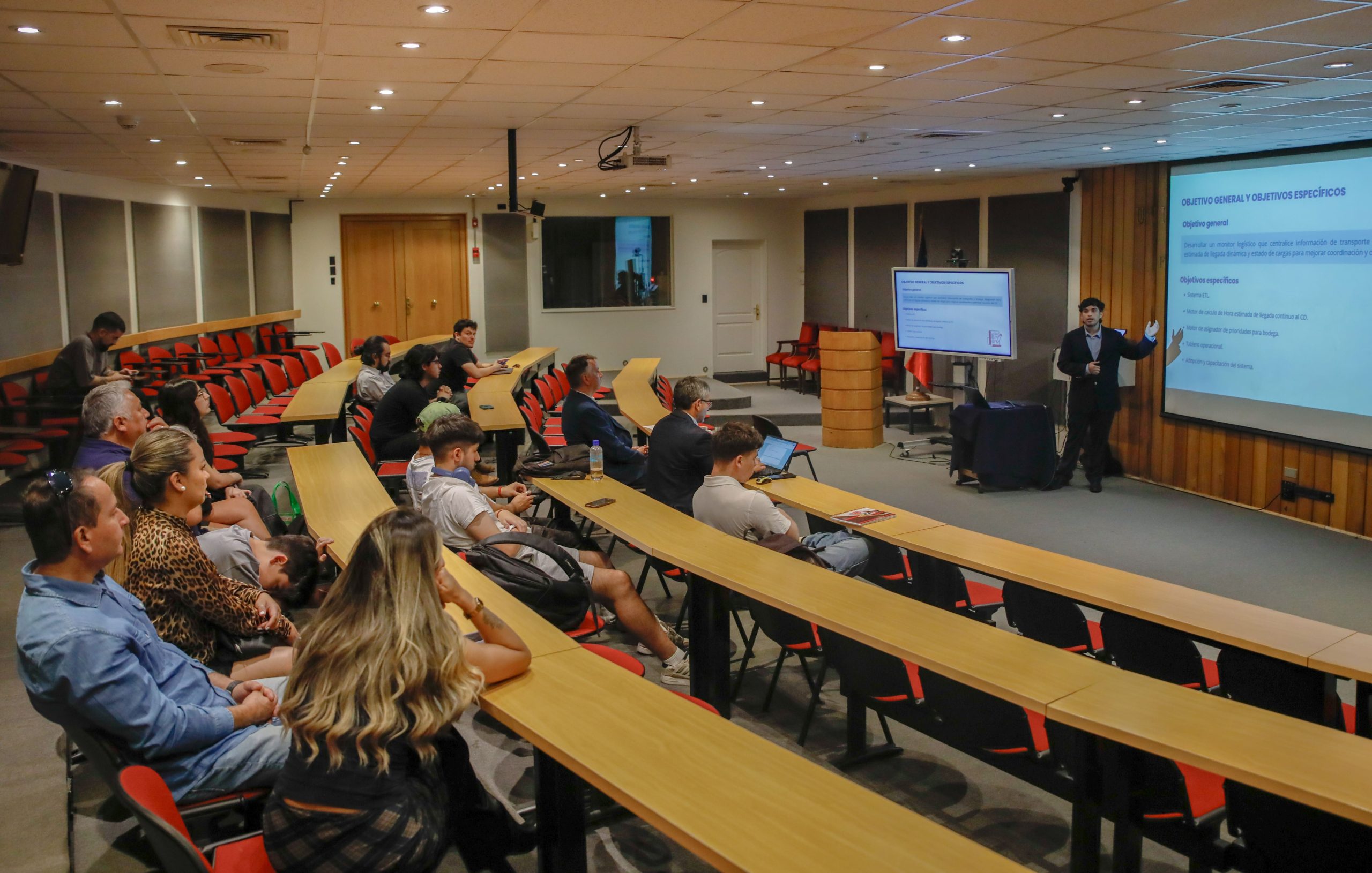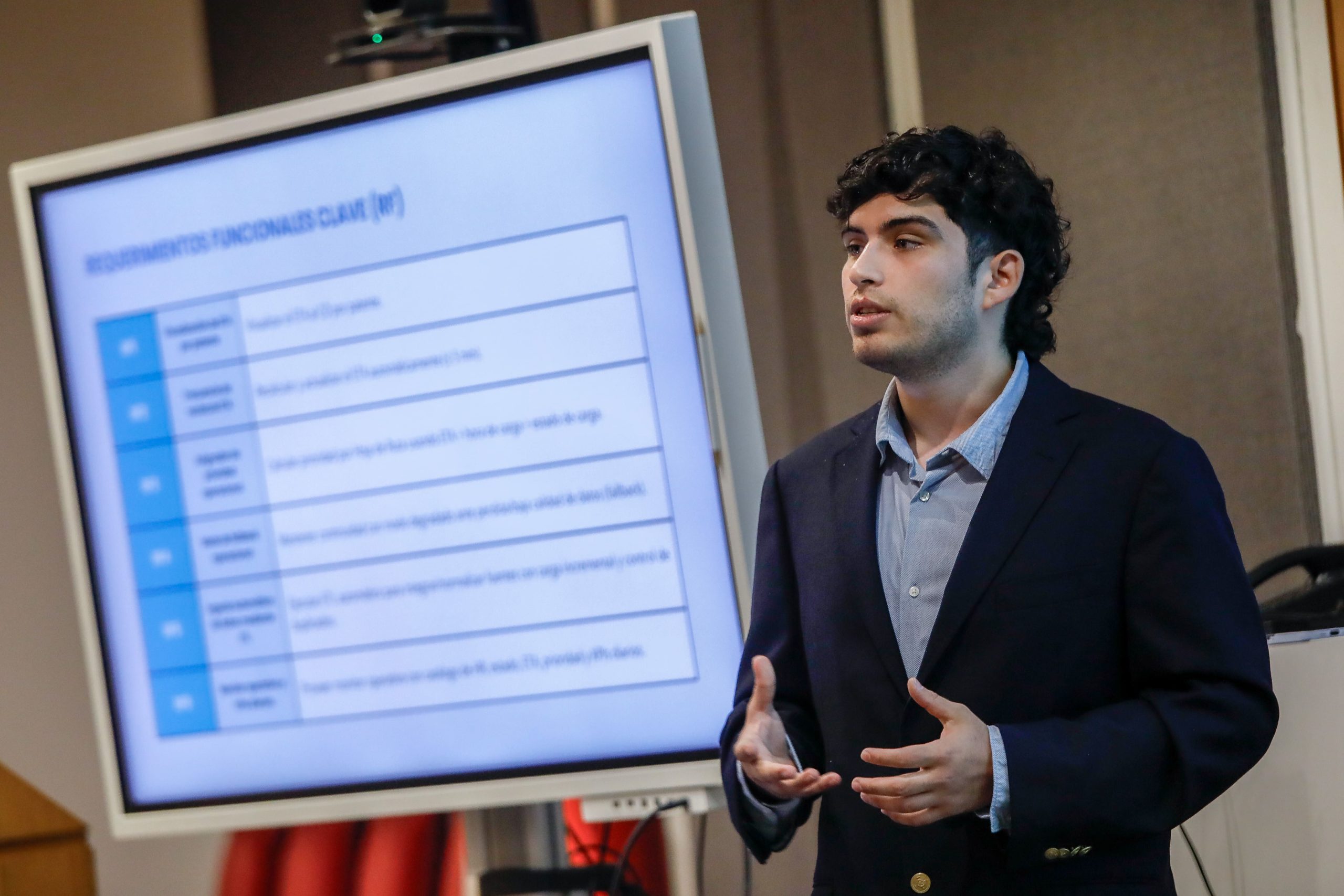 Cristóbal Sagredo presentó su proyecto “Optimización de programación en bodega con ETA en tiempo real”, realizado con la guía del profesor Suchan. La comisión evaluadora contó con el profesor Juan José Negroni.