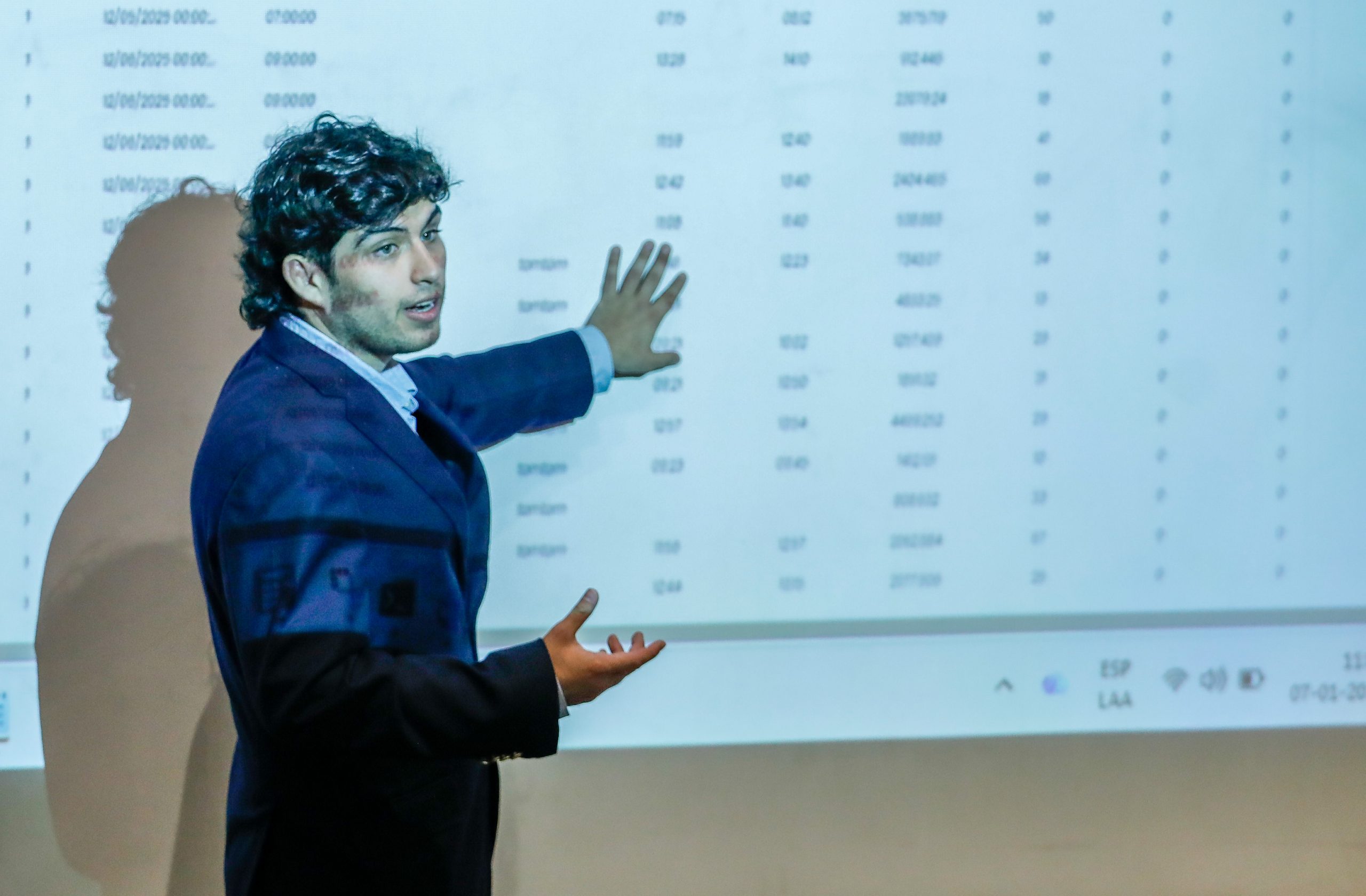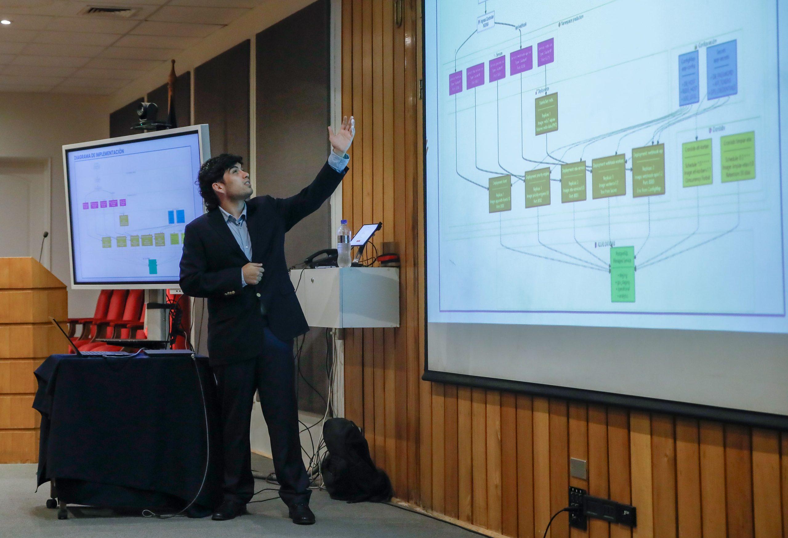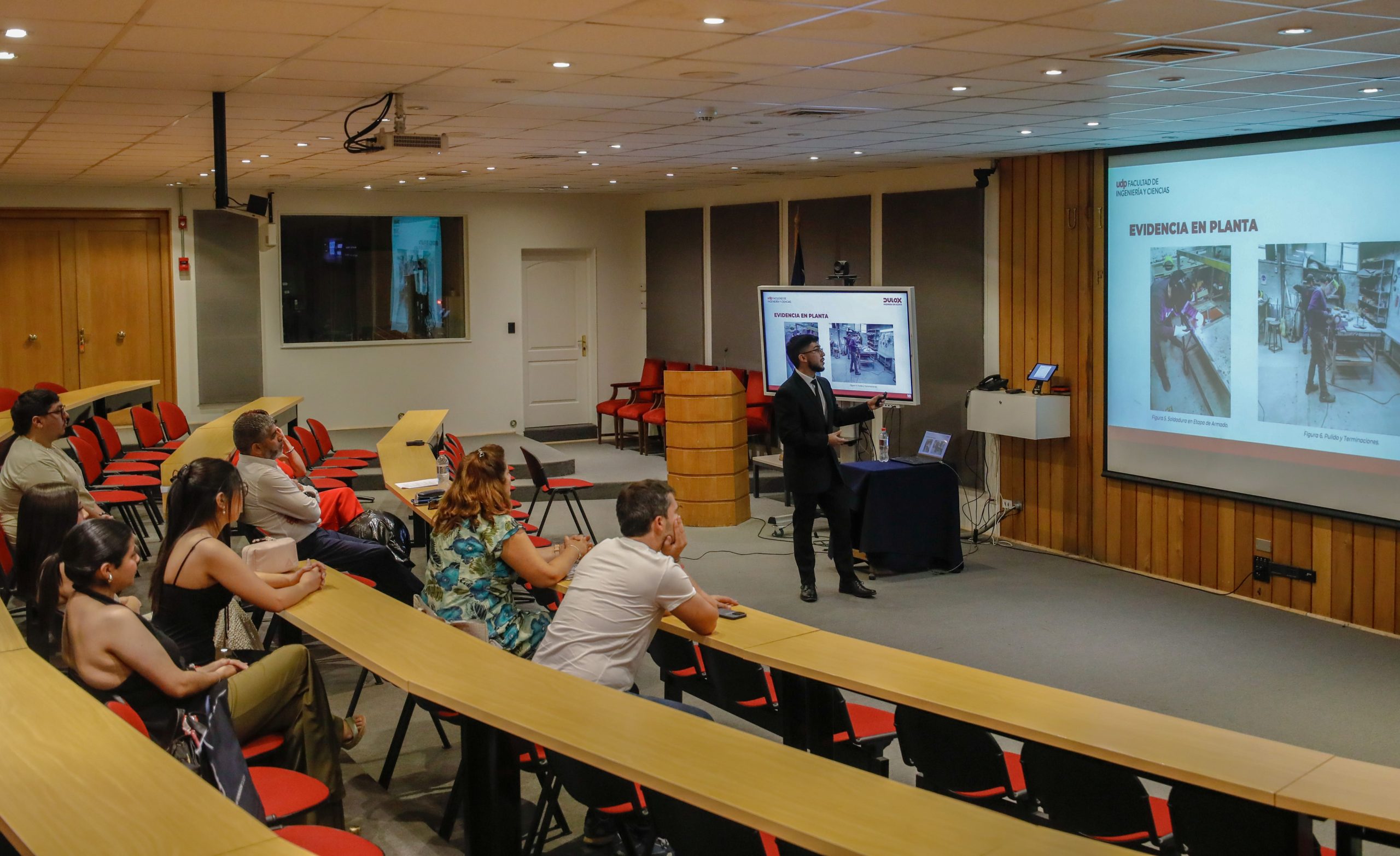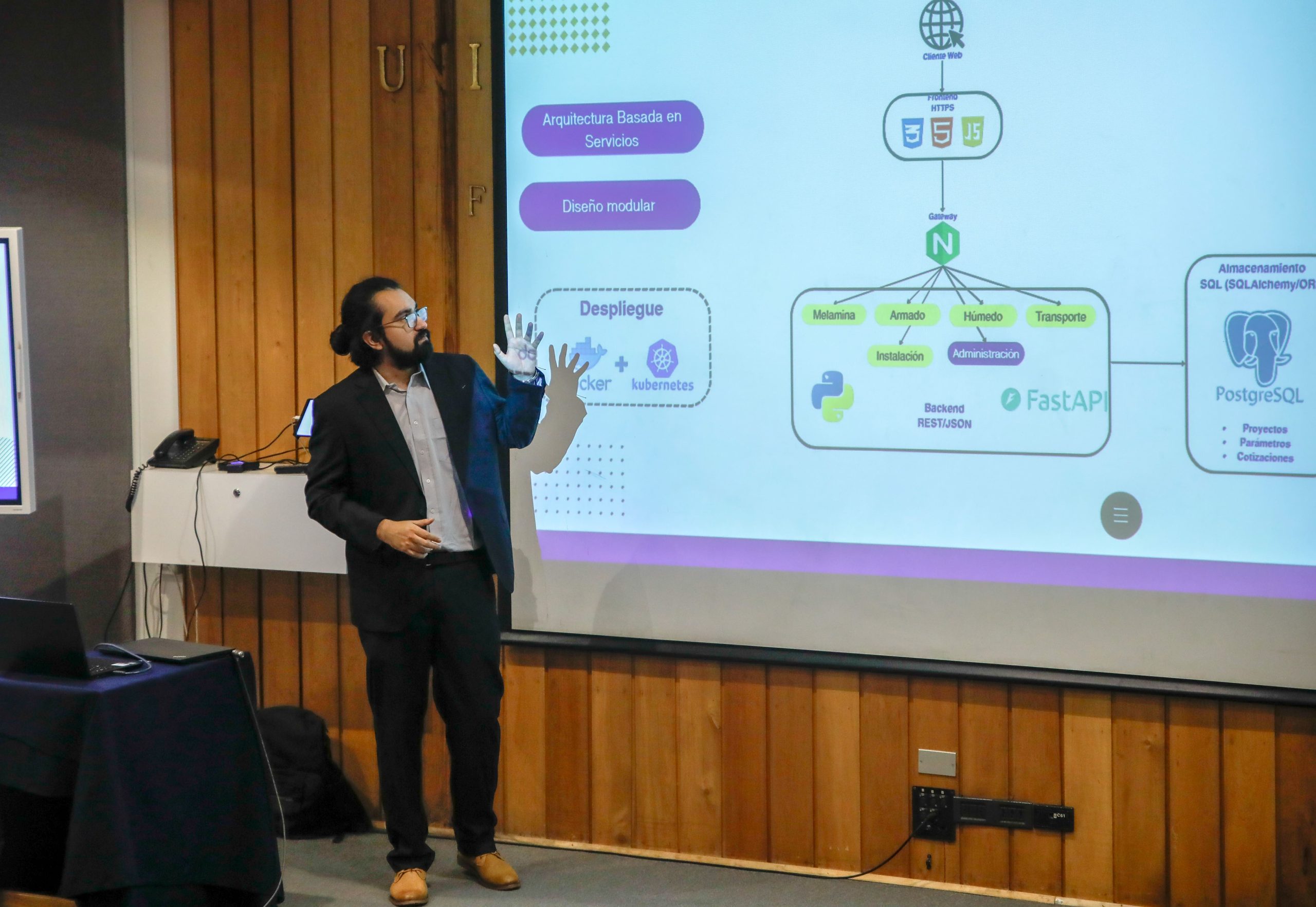 Cristóbal Sagredo presentó su proyecto “Optimización de programación en bodega con ETA en tiempo real”, realizado con la guía del profesor Suchan. La comisión evaluadora contó con el profesor Juan José Negroni.