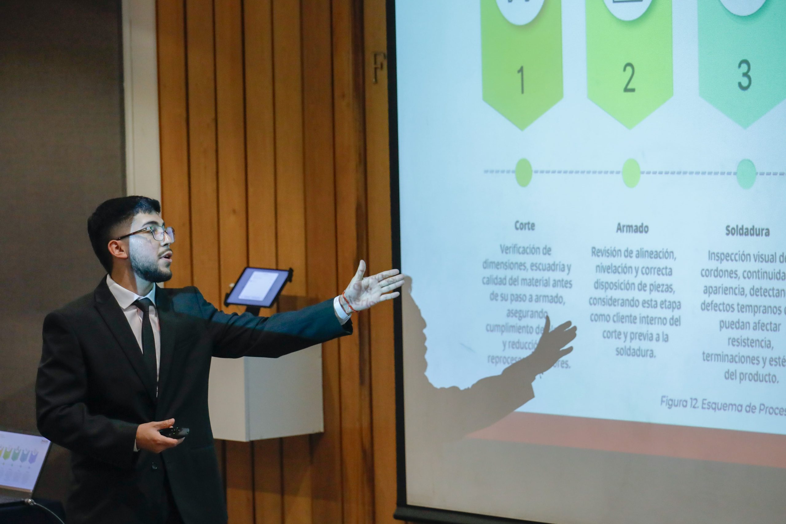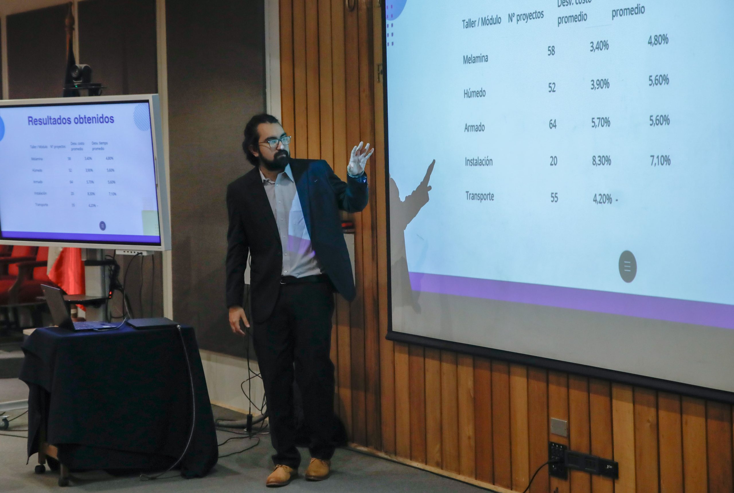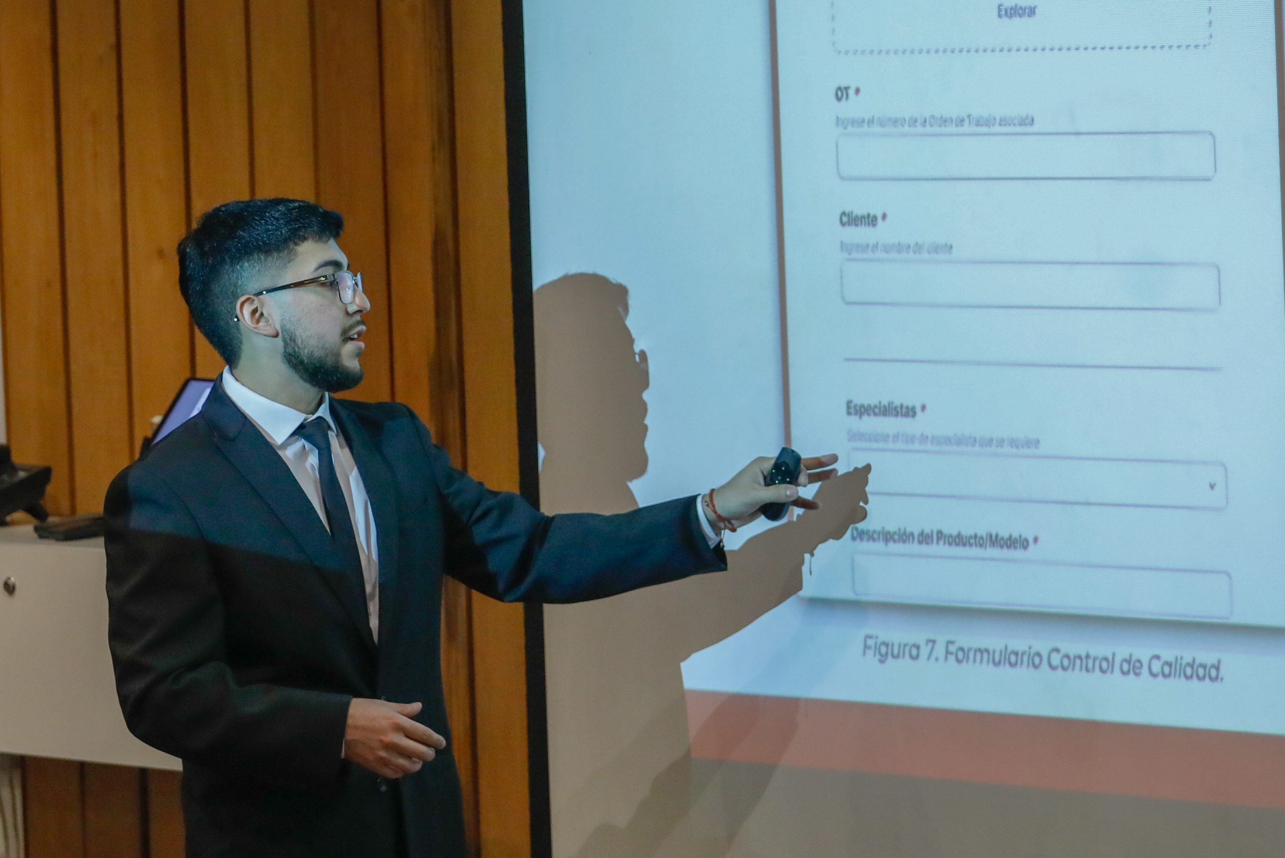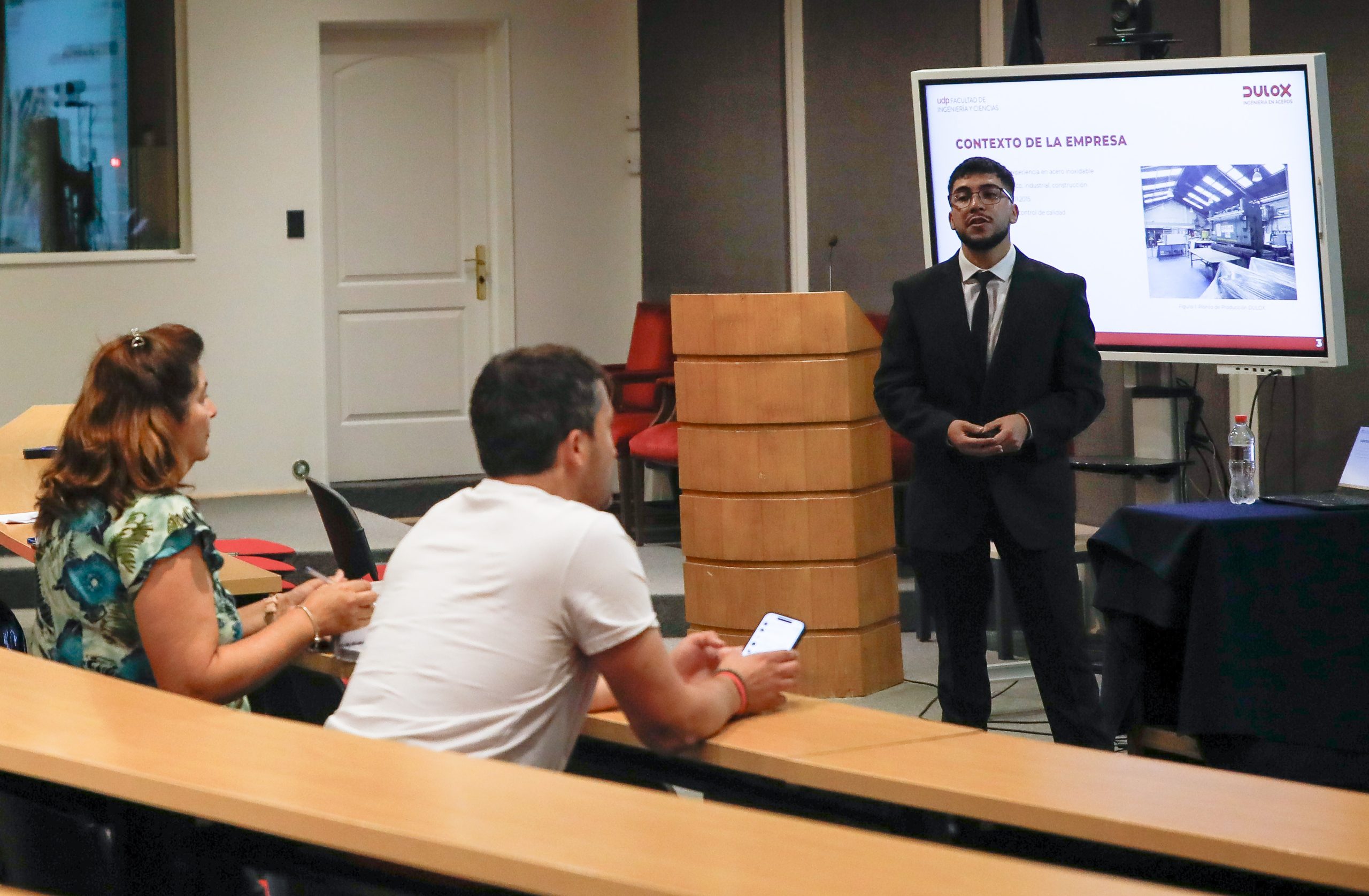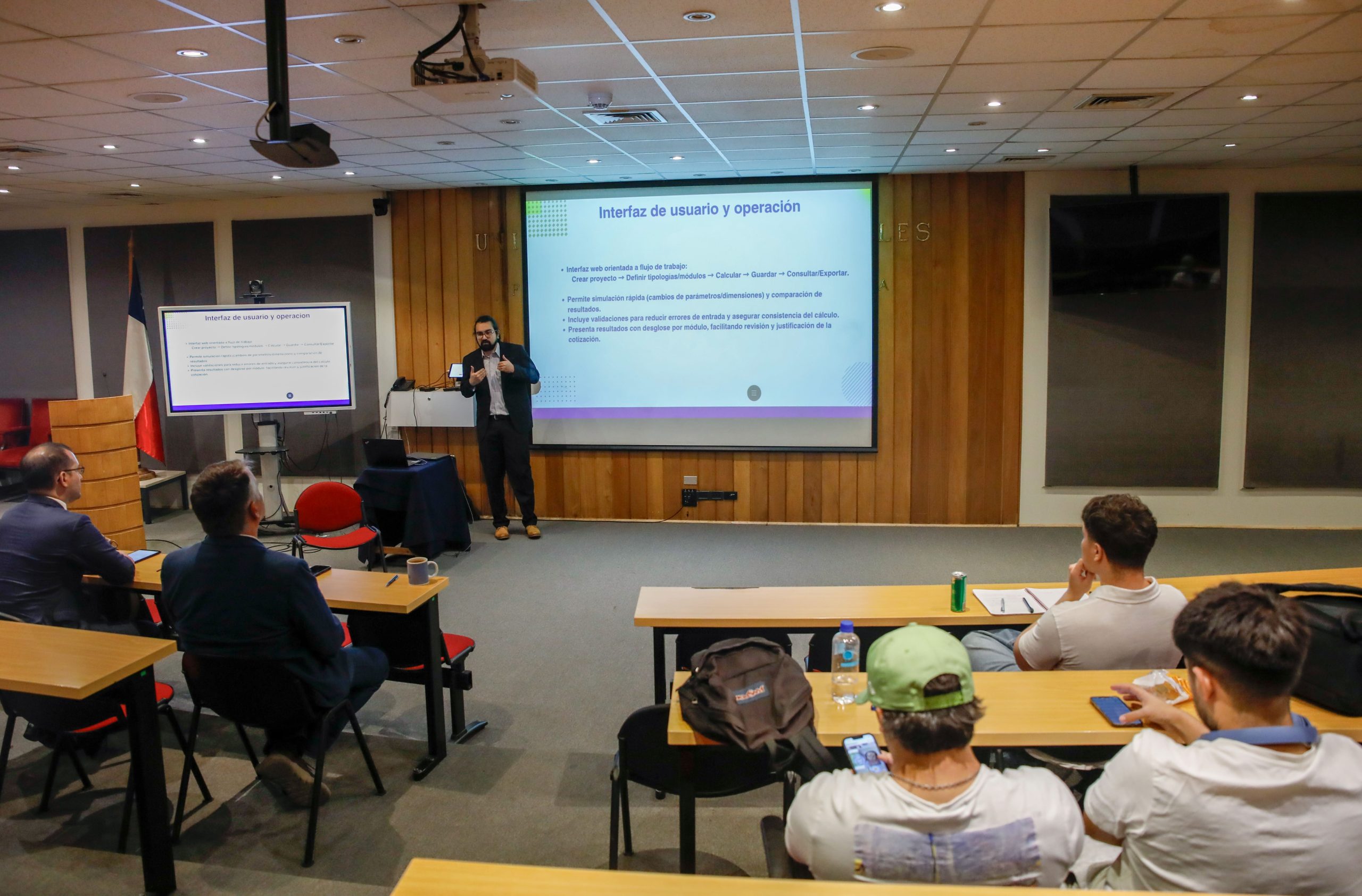 Lucas Ibarra presentó su proyecto “Calculadora de costos y tiempo para proyectos MTO”, realizado con la guía del profesor Suchan. La comisión evaluadora contó con el profesor Pedro Toledo.